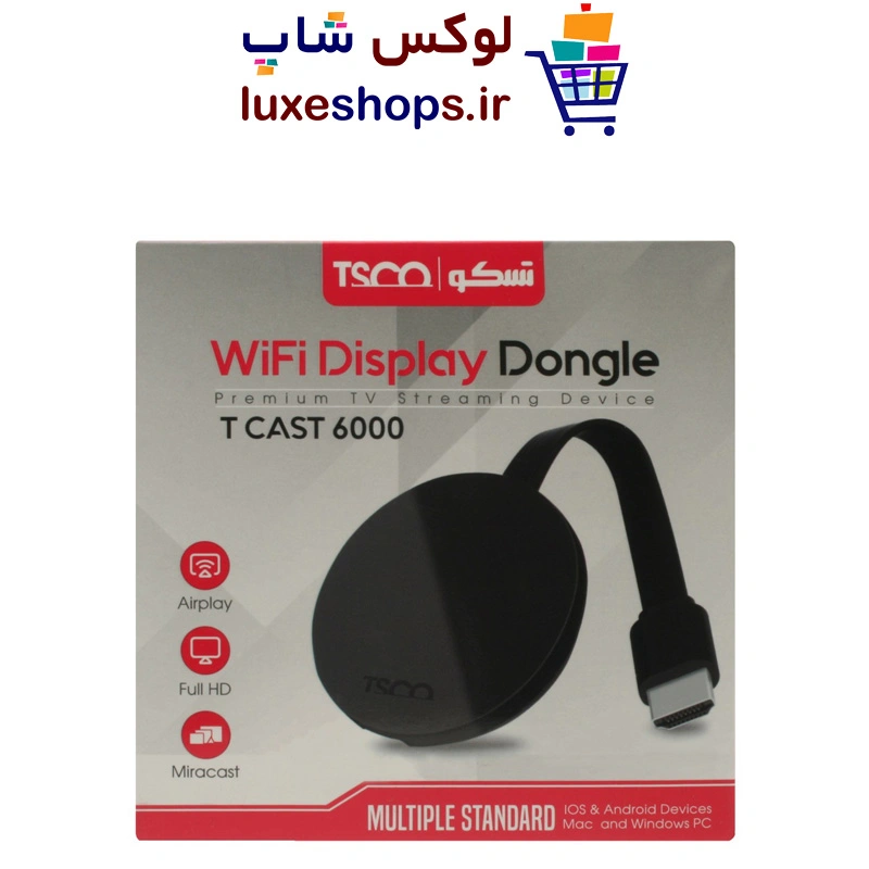 HDMI Dongle مدل T ̣CAST 6000 spec محصولی کوچک و کارآمد از برند تسکو می باشد. که از طریق درگاه HDMI به تلویزیون متصل شده و انرژی مورد نیاز خود را به کمک درگاه USB تامین میکند. این دستگاه بسیار کوچک، با سیستمعاملهای ویندوز ، اندروید ، iOS سازگار بوده و از طریق DLNA ، AirPlay ، Miracast و EZCast به ایجاد ارتباط بیسیم میان دستگاههای مختلف و تلویزیون میپردازد.